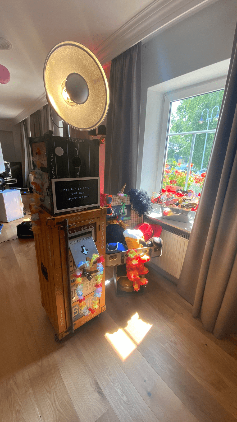 Die Fotobox selbst benötigt nur 30×30 cm. Idealerweise solltest du eine Ecke mit 2*2 m einplanen, damit auch alle Gäste ausreichend Platz finden.